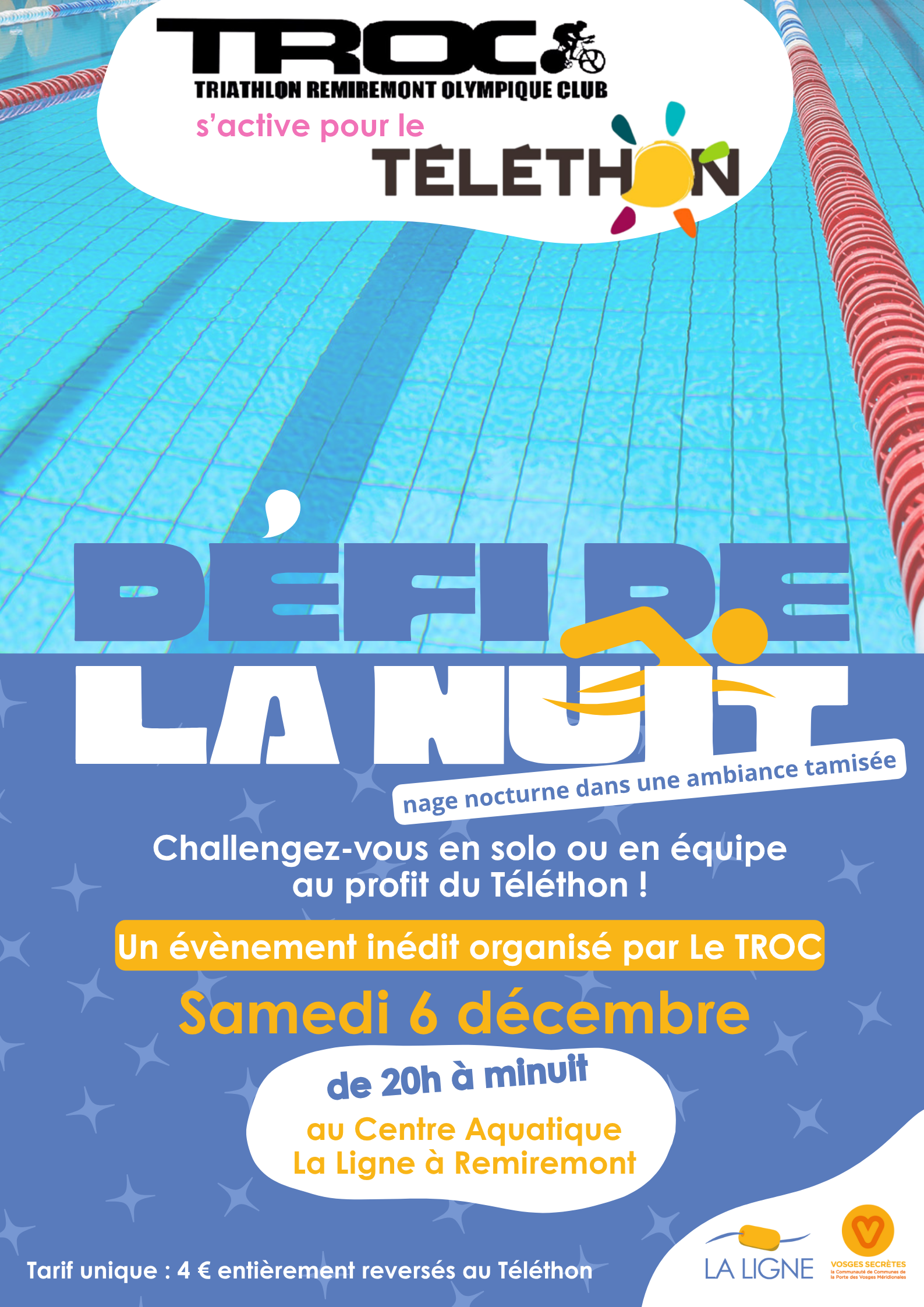 À l’occasion du Téléthon, le centre aquatique La Ligne et le TROC s’unissent pour un événement exceptionnel : Le Défi de la Nuit !