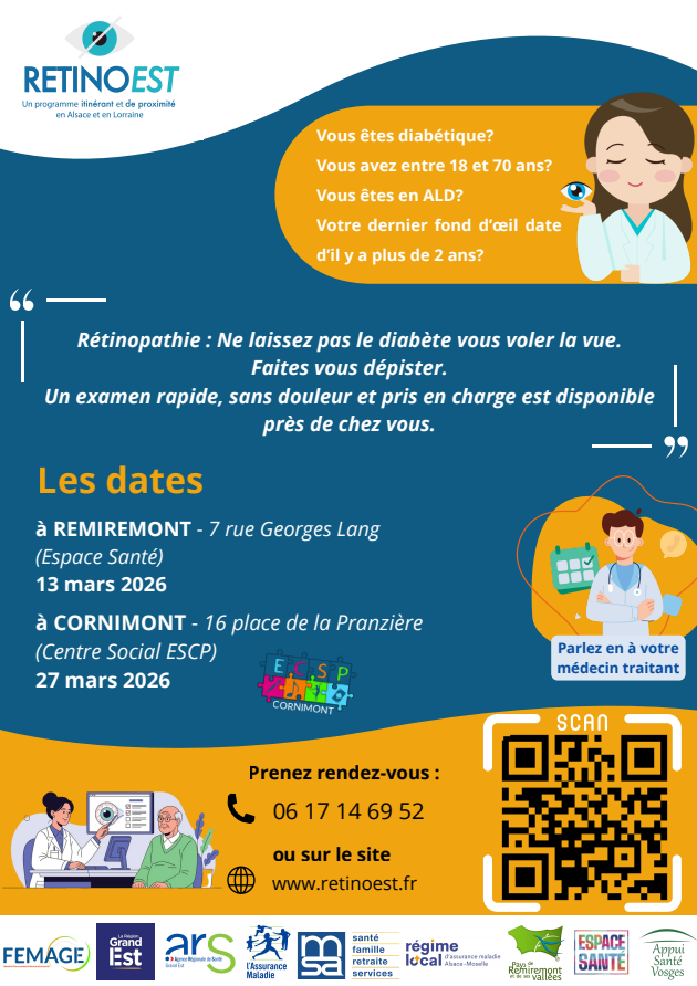 La FEMAGE (association de santé) organise, dans le cadre du programme RETINOEST, une journée de prévention autour du diabète, et plus particulièrement de la rétinopathie diabétique, le 13 mars 2026, à Remiremont, dans les locaux de l’Espace Santé (7 rue Georges Lang).