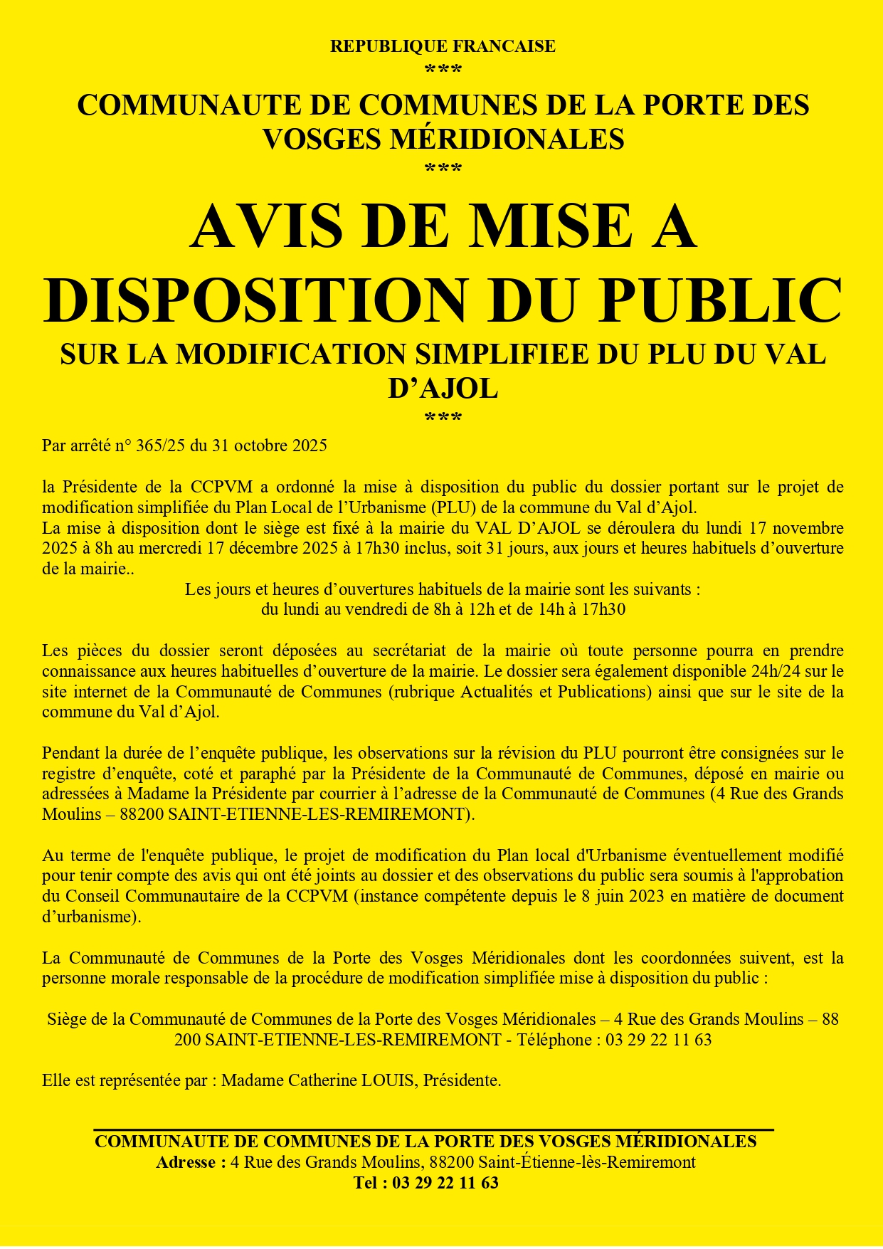 Par arrêté n° 365/25 du 31 octobre 2025, la Présidente de la CCPVM a ordonné la mise à disposition du public du dossier portant sur le projet de modification simplifiée du Plan Local de l’Urbanisme (PLU) de la commune du Val d’Ajol.