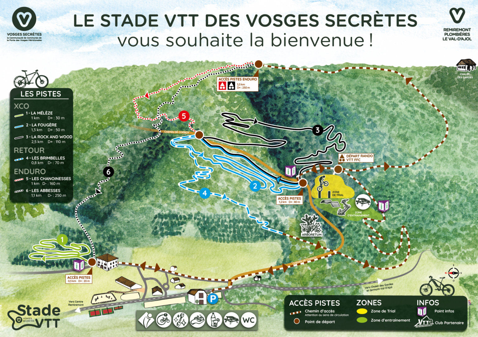 Sentiers naturels et zones techniques aménagées s’associent en un maillage de parcours offrant des éléments techniques tels que : descentes raides / virages relevés / zones de rochers / escaliers / modules / zones ludiques / sauts.